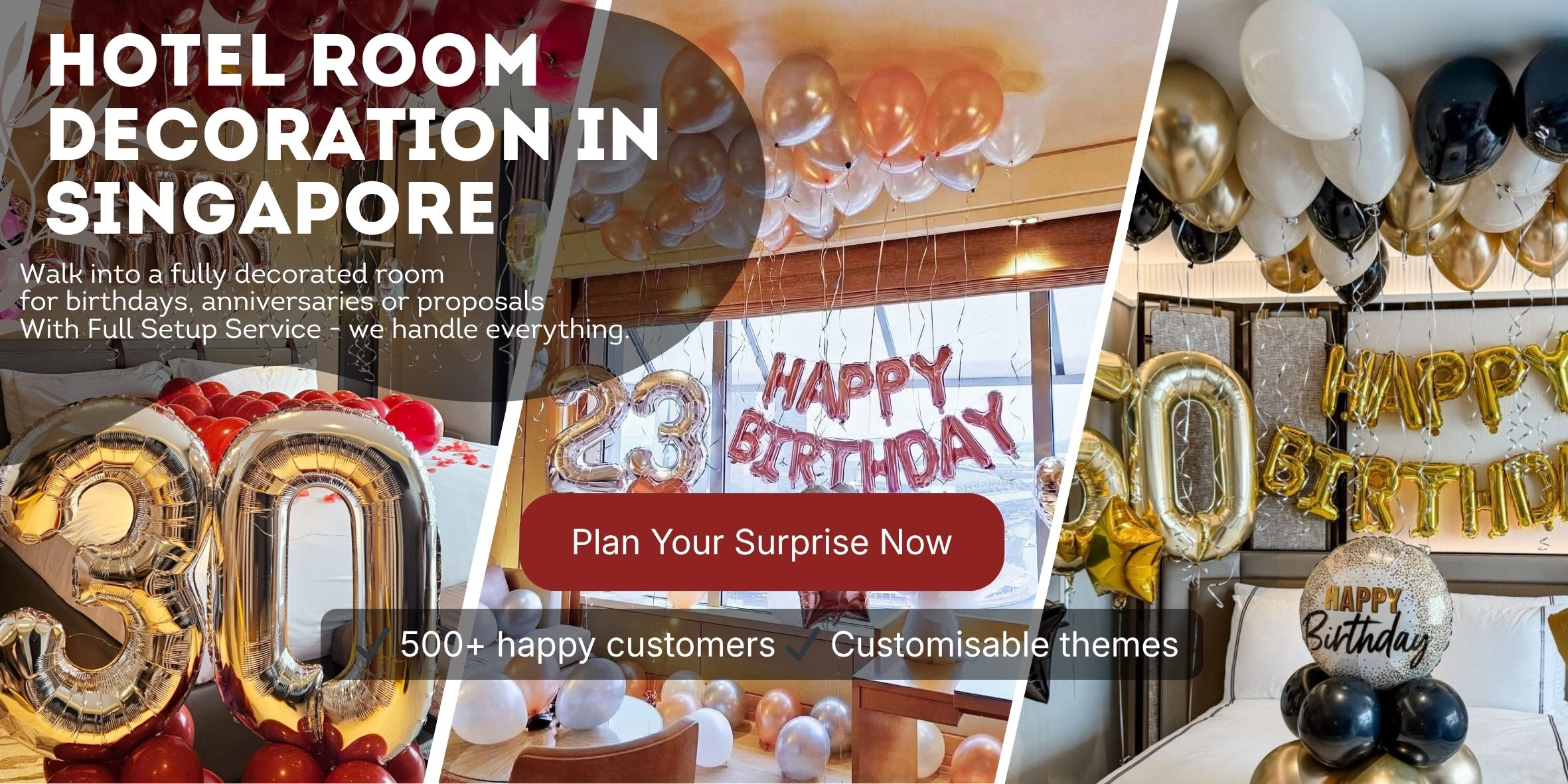 To customise balloons and decorations to your party, drop us a message and we’ll get your package ready, as early as the same day. Our team is thrilled and ready to reinvent party supplies for your perfect balloon party. Whether it’s a party theme, holiday gathering or a special occasion, we’re here to spice up the celebration to make it FUN LAH!