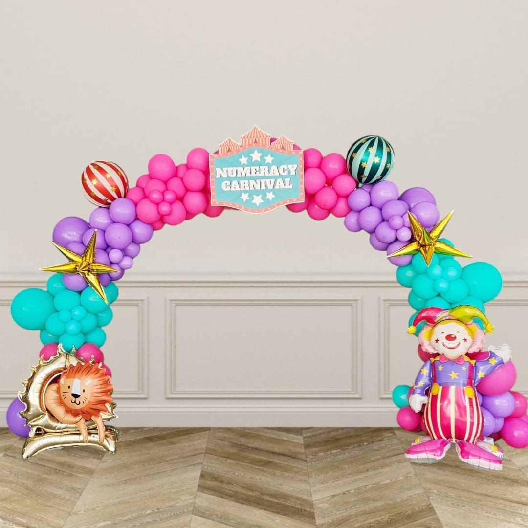 Bring the thrill of the big top to your celebration with this Circus Clown Carnival Balloon Arch. Bursting with vibrant primary colours and playful shapes, the arch features a striped circus canopy motif, clusters of balloons in varying sizes and hues, and a cheerful clown topper that instantly sets a festive tone. Ideal as a photo backdrop or entrance statement, this eye-catching balloon arch captures the whimsical spirit of carnivals, funfairs and children’s parties.