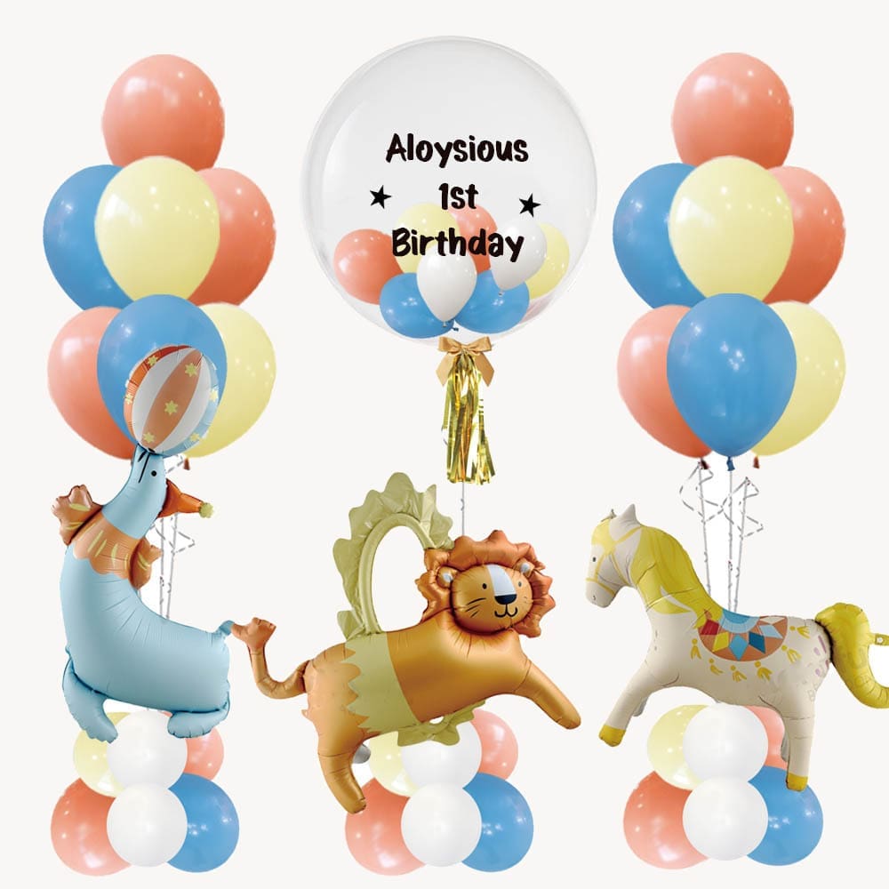 Transform your event into a whimsical wonderland with our Circus Enchanted Balloon Package. This vibrant collection features an array of colourful balloons in various shapes and sizes, perfect for creating a magical atmosphere at any celebration. The centrepiece is a stunning balloon arch adorned with playful circus-themed elements, including a charming lion, joyful seal, and festive horse.