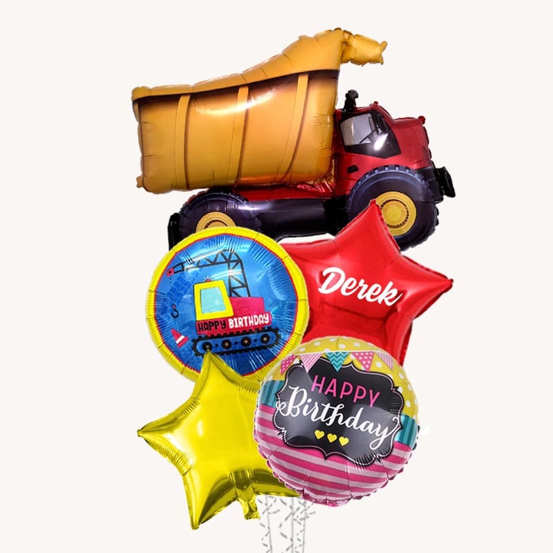 Construction Truck Birthday Balloon Bouquet. Pick up this balloon bouquet match by Funlah. Great for all party themes if you require a change in colours please notify us. Stand out in birthday parties, pool parties and anniversaries. Match these with assorted balloon bouquets lastly please deflate them and reuse or discard accordingly. View our package themes for more ideas.