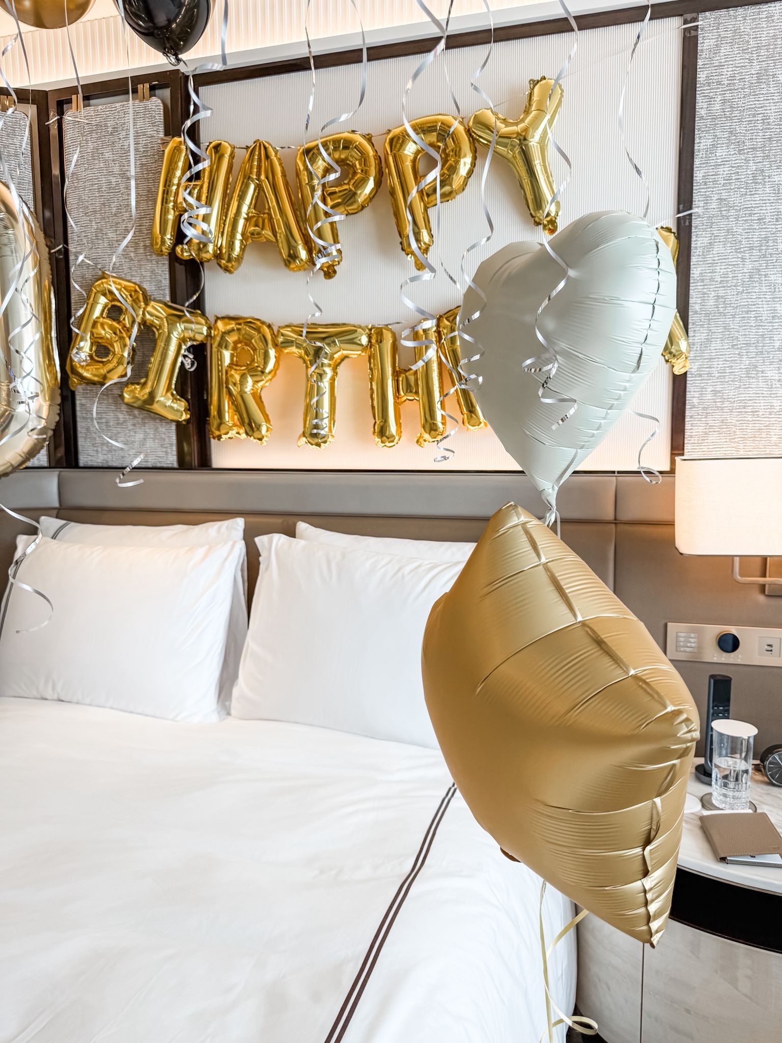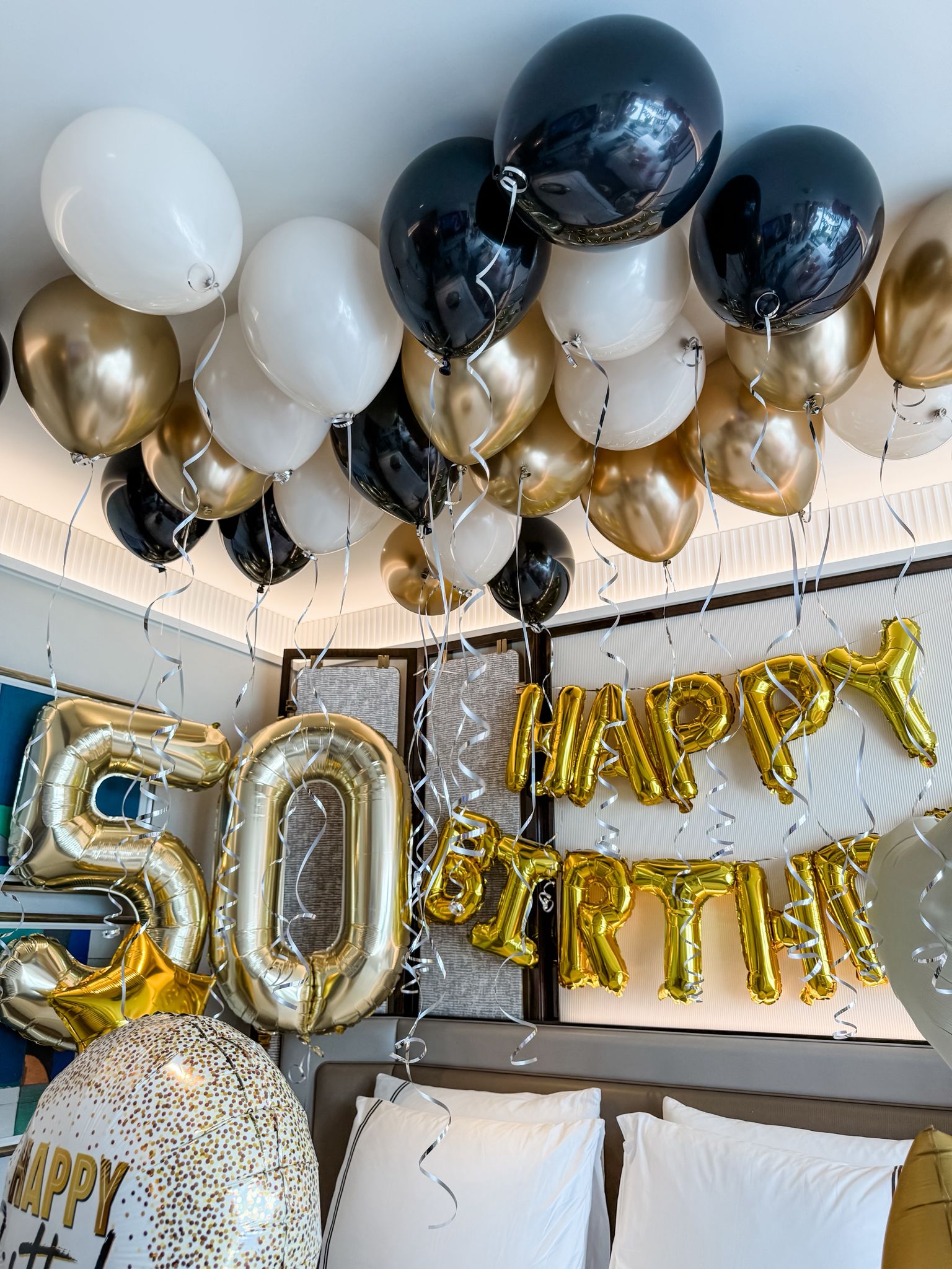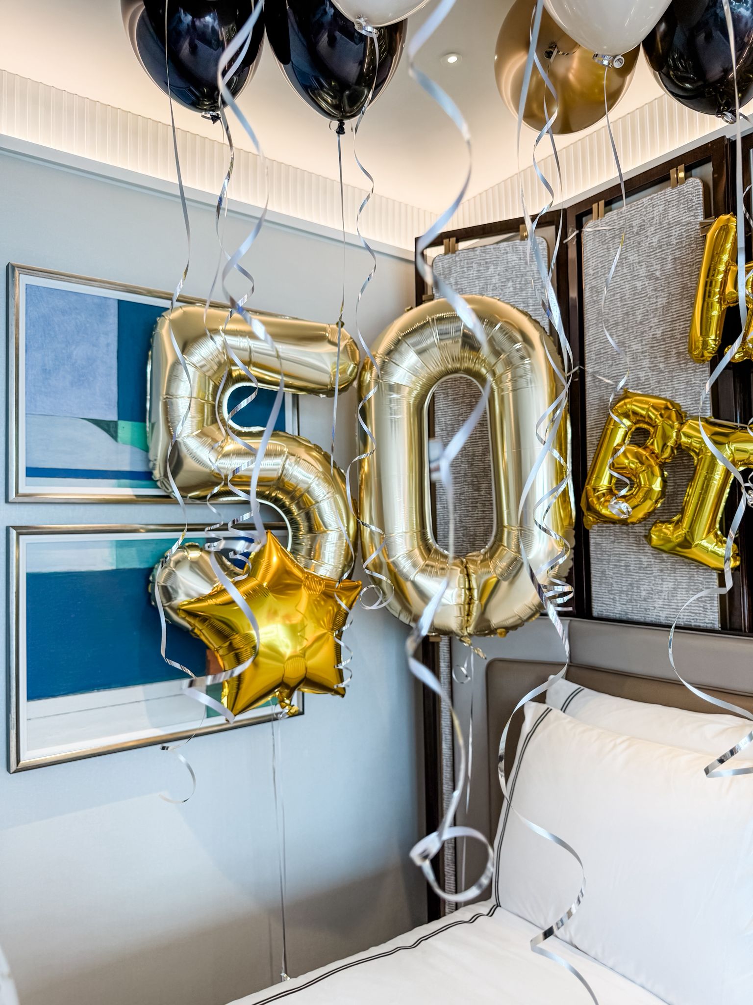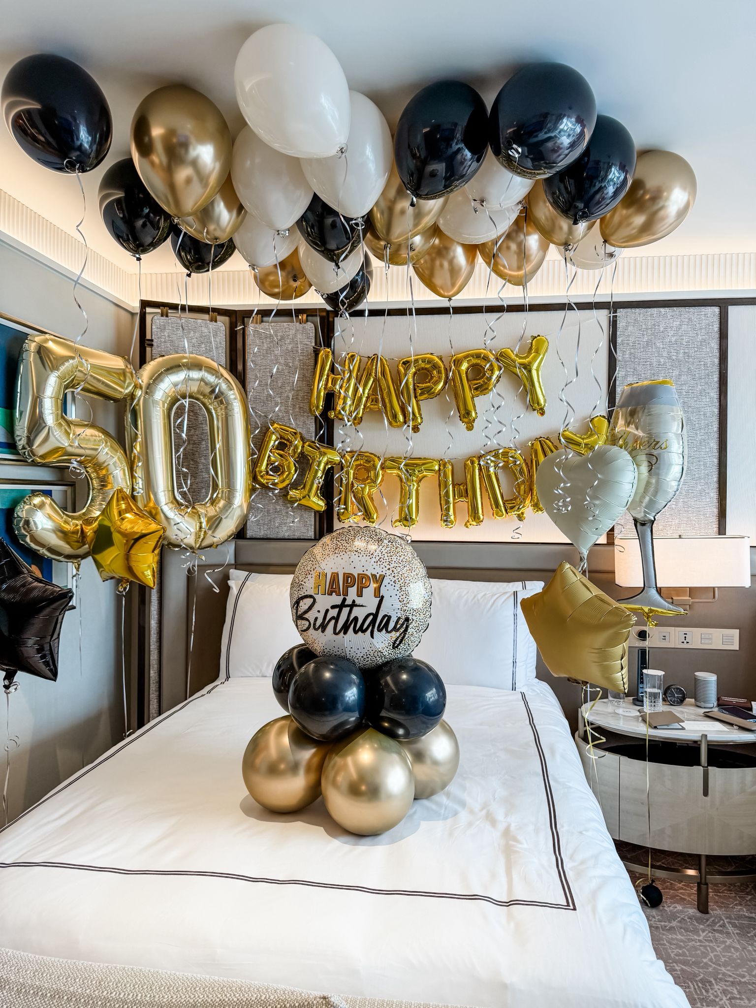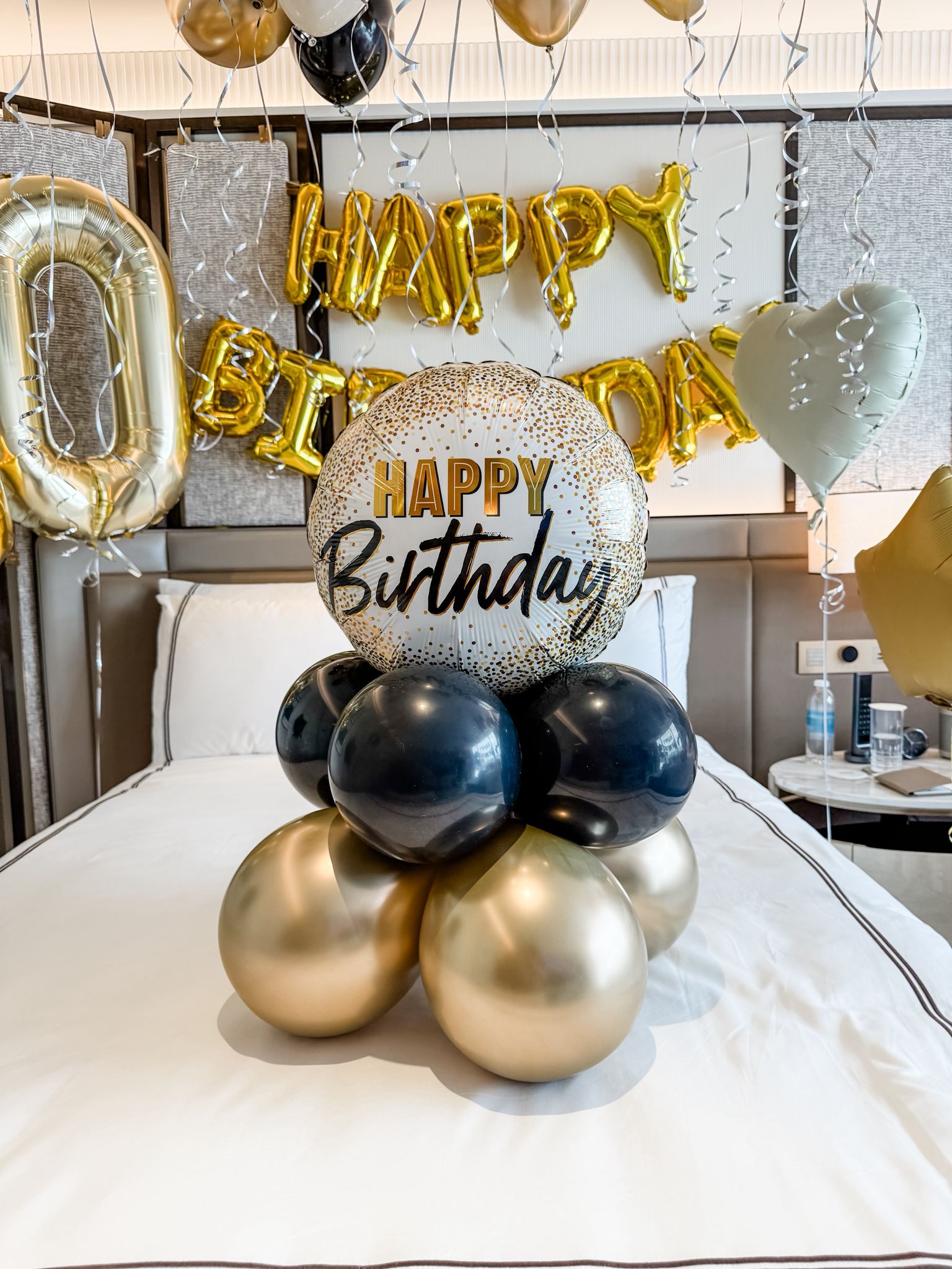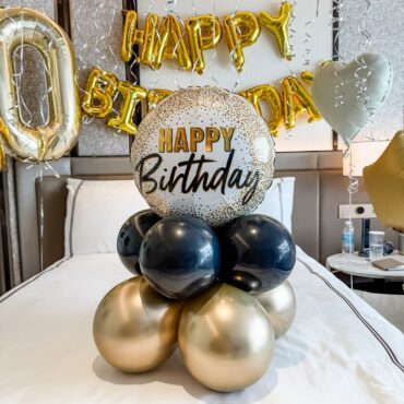 Create an unforgettable hotel-room surprise with this elegant black and gold birthday balloon package. Glossy black balloons and shimmering gold foil combine to give the room a sophisticated, celebratory atmosphere, while smaller accent balloons add depth and movement across the bed and bedside area. Ideal for an intimate birthday celebration, the monochrome palette and bold typography deliver instant impact and a polished look that photographs beautifully.