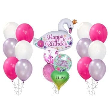 Floral Swan Birthday Balloon Bouquet. Pick the bouquet of your choice uniquely match by Funlah. Great for all party themes if you require a change in colours please notify us. Stand out in birthday parties, pool parties and anniversaries. Match these with assorted balloon bouquets lastly please deflate them and reuse or discard accordingly. View our package themes for more ideas.