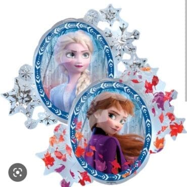 - Large 2 sided character foil balloon with intricate border design featuring Elsa and Anna at the other side