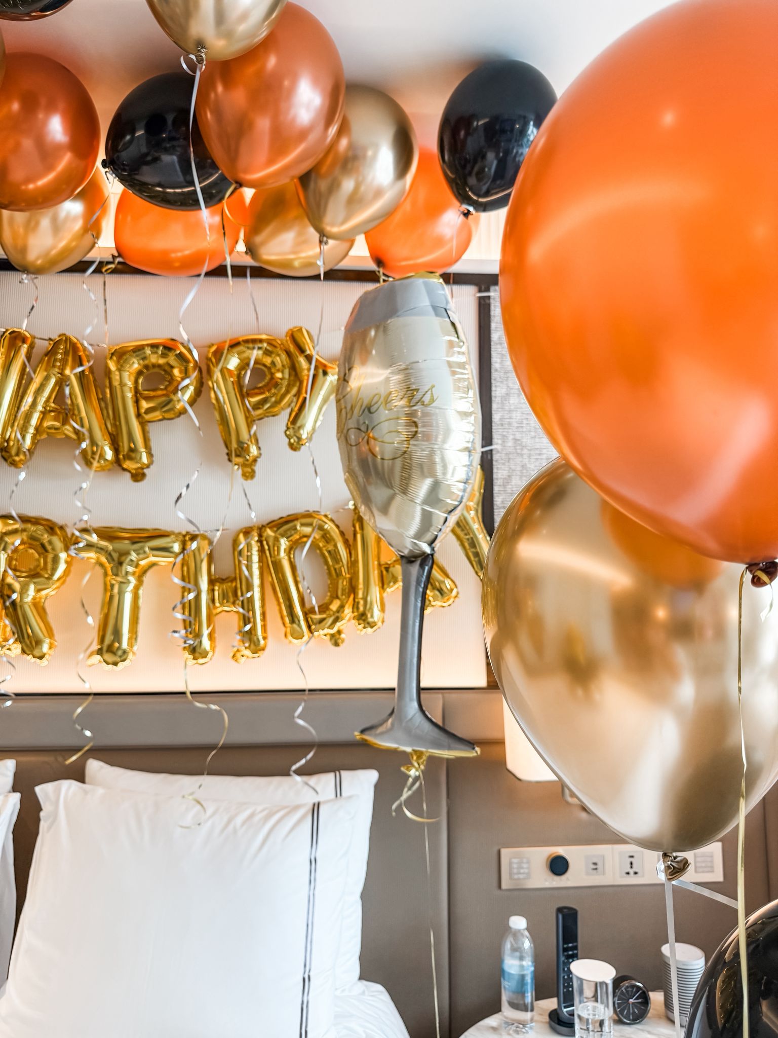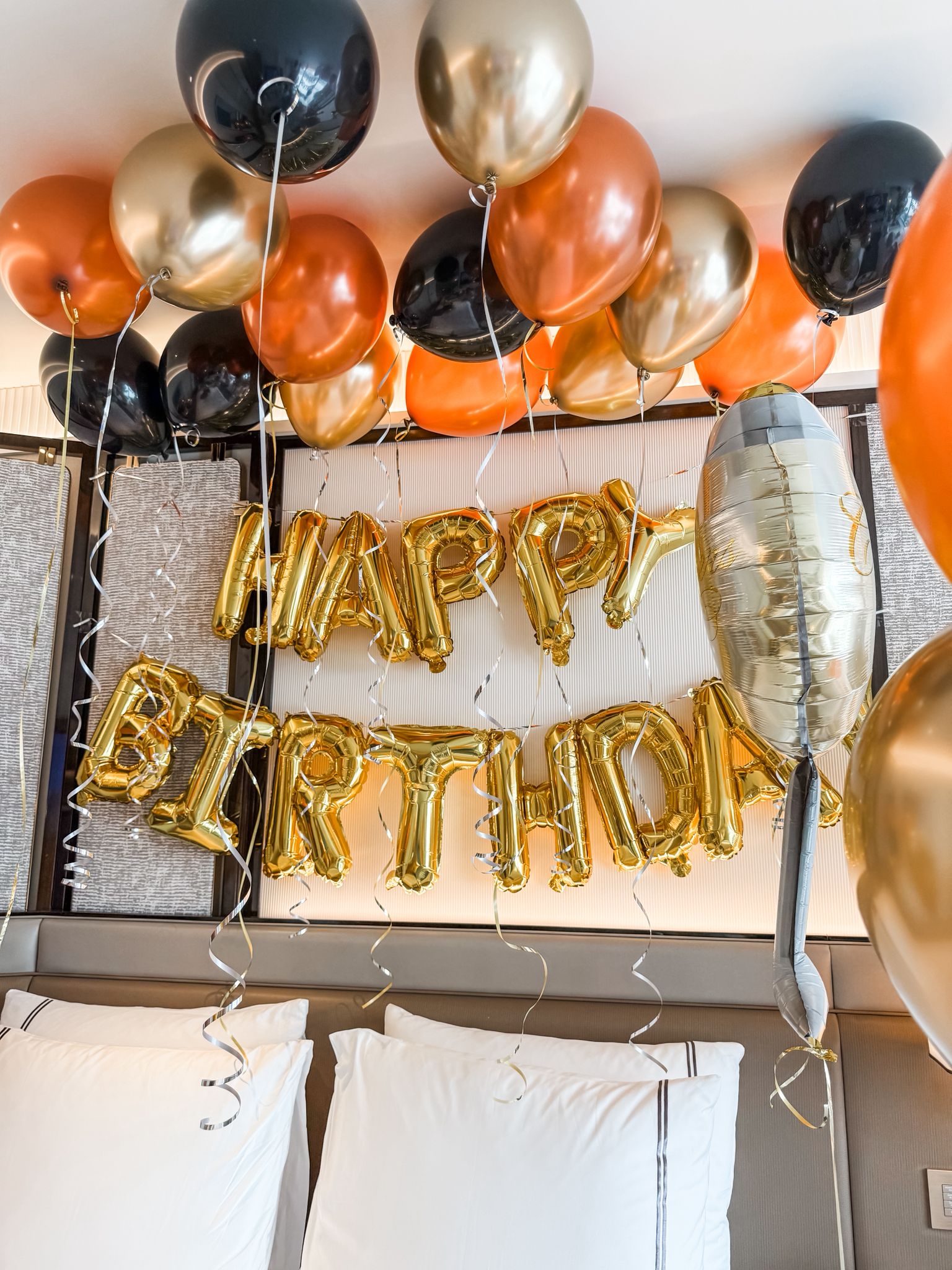 Celebrate a milestone with the Aged to Perfection Whiskey Hotel Room Balloon Package, captured in this stylish hotel-room setup. The arrangement centres on whiskey-themed foil balloons, a prominent “Aged to Perfection” on whiskey bottle balloon. Complementary palette of black, gold and copper round and star balloons with metallic accents create a sophisticated, celebratory atmosphere ideal for birthdays, anniversaries or special adult occasions.