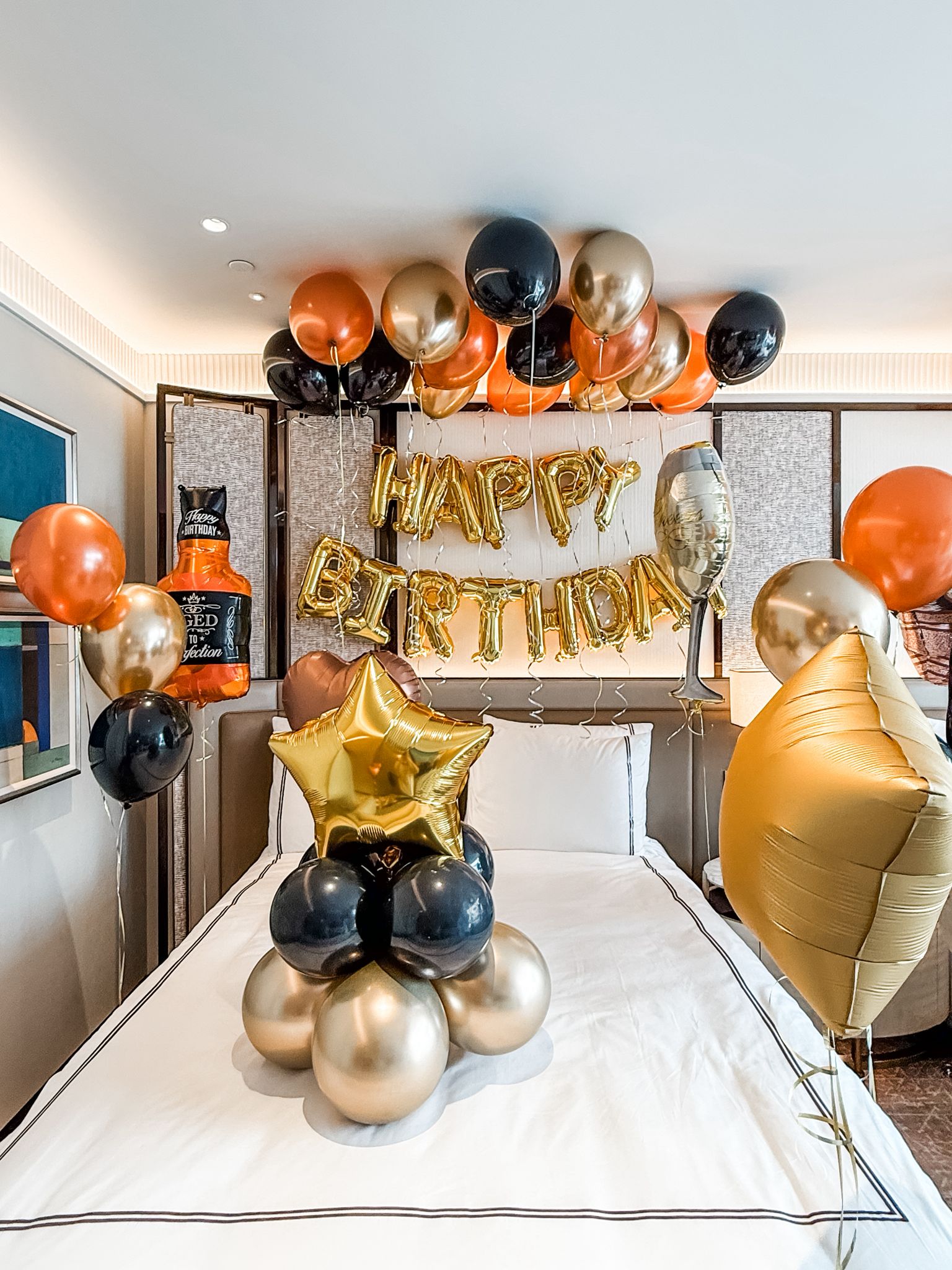 - Balloon bunches arranged around a hotel bed for an intimate surprise