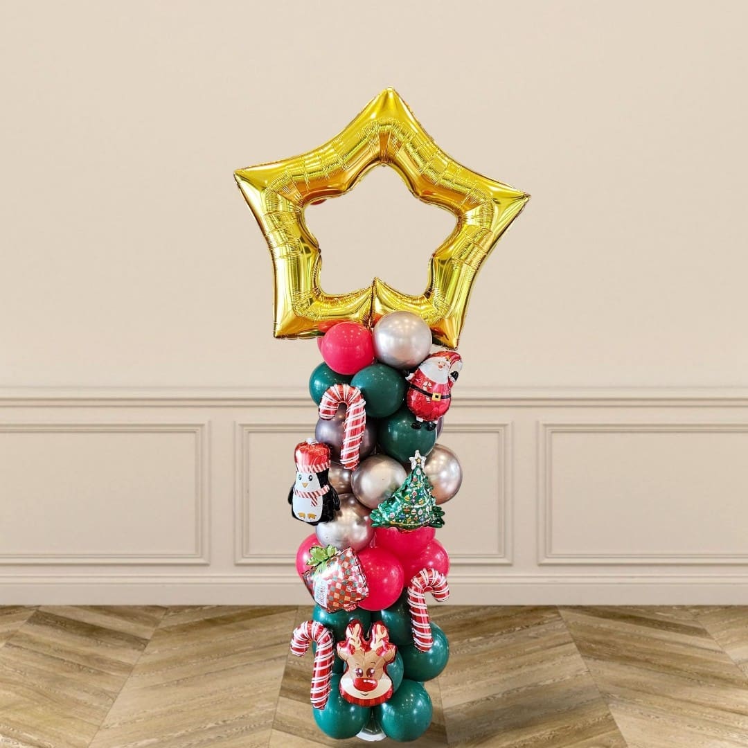 Bring festive sparkle to any Christmas setting with this eye-catching Christmas balloon column. The arrangement features a large metallic gold star balloon as a topper and a striking vertical column of alternating red, green, white and gold balloons. Several balloons display seasonal motifs and snowflake prints, while a mix of matte and metallic finishes adds depth and shine. The column stands on a neatly wrapped base that echoes the seasonal theme, creating a polished, photo-ready decoration. Perfect for creating an instant focal point at Christmas parties, shop windows and seasonal displays, this decoration combines classic festive colours with modern balloon styling for maximum visual impact.