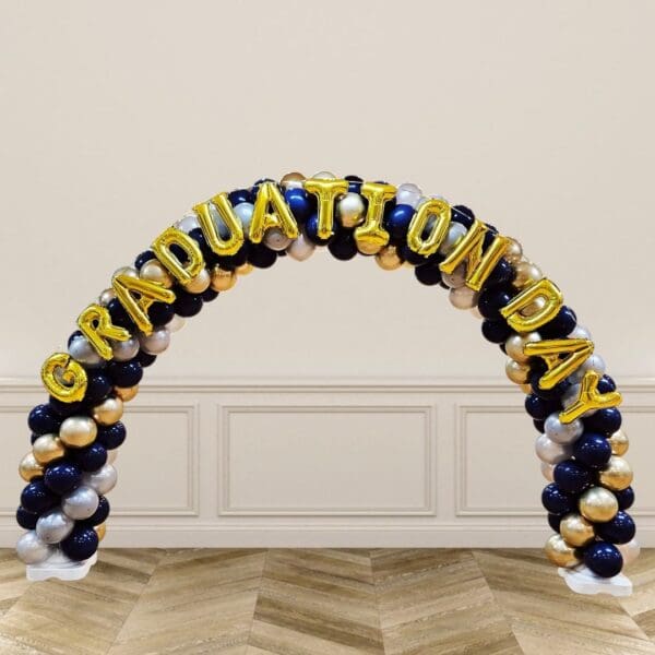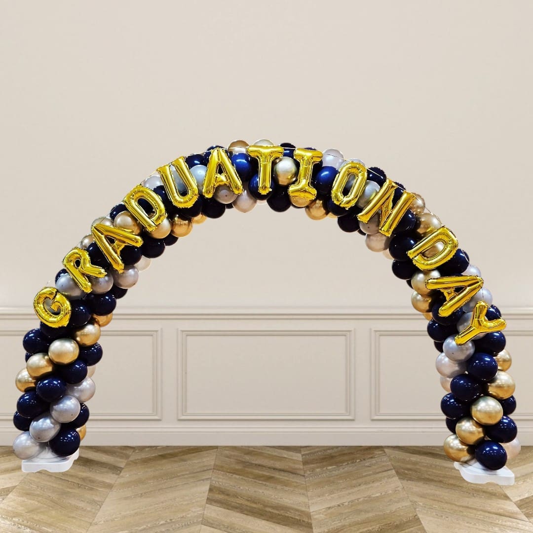 Create an unforgettable Graduation Day moment with the spiral balloon arch shown in the image. This striking arch features a dynamic spiral of black, white and metallic gold balloons in mixed sizes, forming a dimensional frame that draws the eye and lifts any celebration. The metallic gold accents catch the light for a celebratory sparkle while the strong contrast between dark and light balloons creates a polished, photogenic backdrop ideal for graduation photos, entryways and party focal points. Perfect for themed décor, this spiral balloon arch gives your event a stylish, celebratory centrepiece that enhances the atmosphere and photography opportunities.