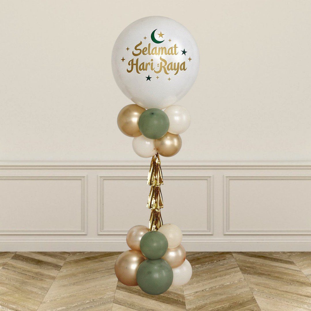 Bring an elegant Hari Raya statement to your celebration with the Gold Sands balloon pillar shown in the image. The vertical column is assembled from clusters of round balloons in warm gold and white sand tones, combining metallic sheen and soft matte finishes for depth and sparkle. Mixed balloon sizes create a textured, sculptural silhouette that reads as a festive centrepiece and a ready-made photo backdrop. The pillar’s balanced base and prominent top cluster give it a polished, eye-catching presence suitable for entranceways, greeting areas or an Hari Raya / Eid photo corner.