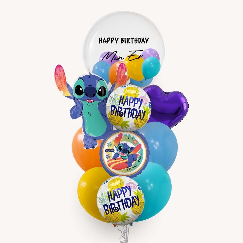 Bring a slice of Disney fun to any birthday with this Lilo & Stitch Happy Birthday deluxe balloon bouquet. The arrangement centres on a playful Stitch-shaped foil balloon and a colourful Happy Birthday medal-style foil, surrounded by a cheerful cluster of round and star-shaped balloons in coordinating shades of blue, pink and white. The mix of character and colour creates an instant party focal point that pairs perfectly with a Hawaiian, tropical or character-themed celebration for children and fans of the movie.