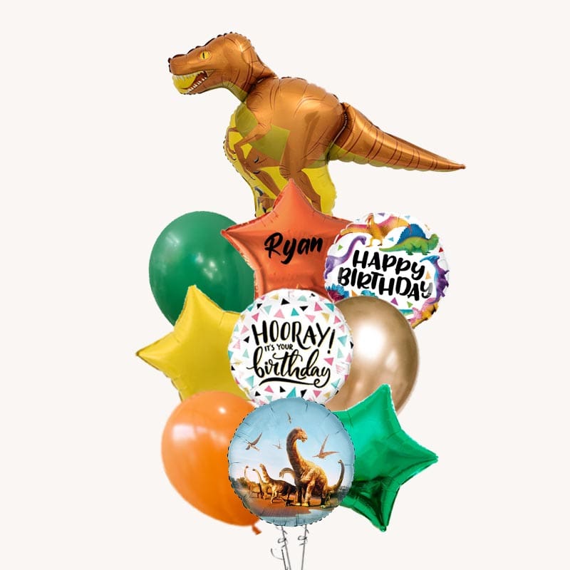 A striking dinosaur-themed balloon arrangement that transforms any celebration into a prehistoric party. This eye-catching display centres on a large, lifelike raptor head balloon surrounded by complementary patterned and foil balloons for extra sparkle. Perfect as a birthday centrepiece, party backdrop accent or gift for a dinosaur lover, the Grand Balloon Bouquet brings dramatic height and playful detail to your décor.