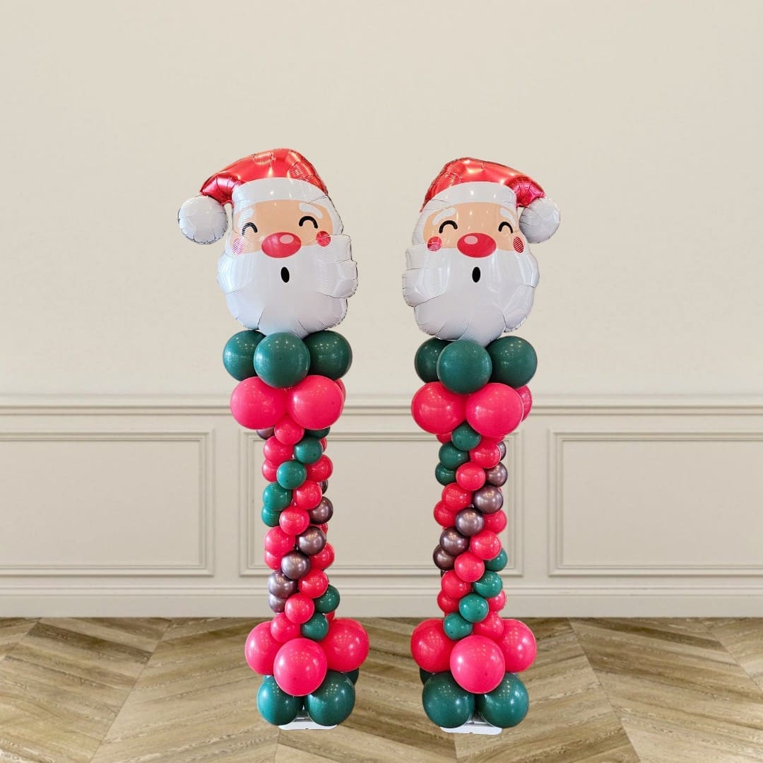 Santa Claus Christmas Roman Balloon Column — festive balloon column with classic Santa topper. This tall, eye-catching display features a stacked Roman-style column of alternating red and white balloon bands topped by a cheerful Santa Claus figure in a traditional red suit and white beard. The column sits on a green base trimmed with seasonal holly and gift motifs, creating a vivid vertical decoration that instantly conveys a classic Christmas atmosphere.