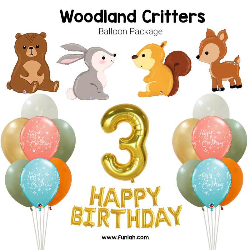 Take a trip to a Enchanted Forest with our Woodland Critters Birthday Balloon Package for a fun-filled birthday party, surprise party or any special occasion. Add on a Personalized 24″ balloon for a full complete set. View more animated birthday bash packages here. Beat the hassle of finding individual balloons for your party or event! Helium balloons and balloon garlands will be ready made upon self collection/delivered.