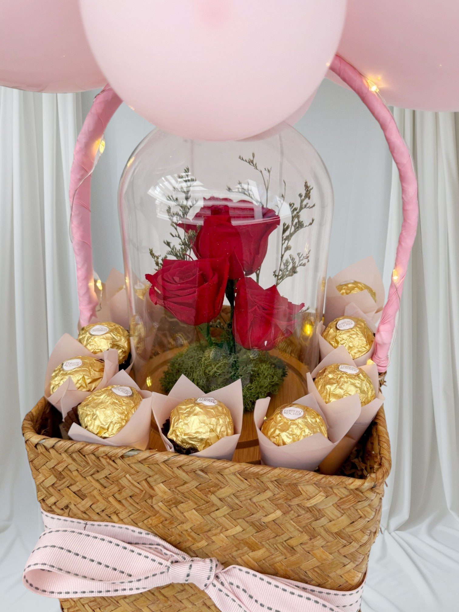 Everything is included in one stunning bundle. Balloons, lights, rose dome, chocolates and basket – so you don’t need to shop for anything else.