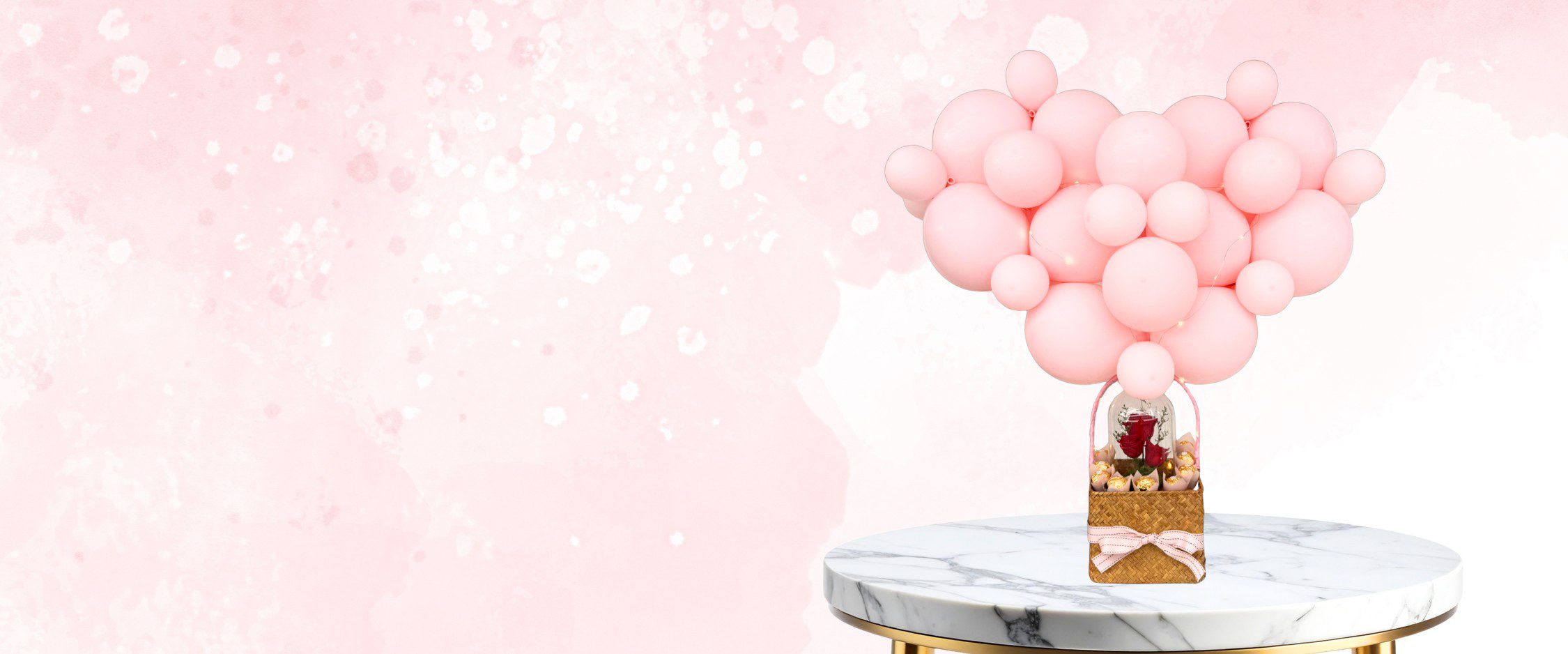 Soft blush balloons, warm fairy lights, a long lasting rose and sweet treats –